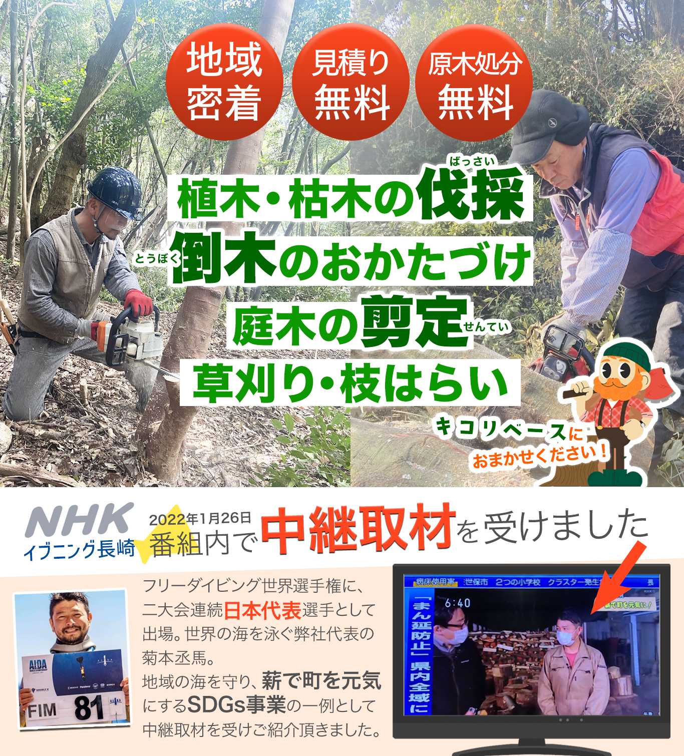 私たちは長崎県の川棚町エリアの、植木・枯木の伐採、間伐、倒木の撤去、庭木の剪定、草払い(草刈り)、枝払いなど、樹木に関すること全般をお任せいただいております、プロの木こり集団です。
